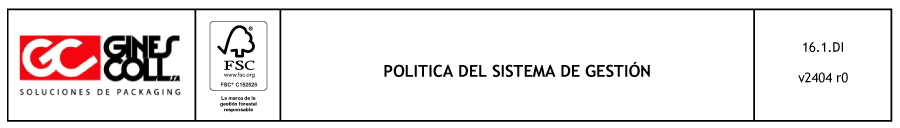 La Política de Calidad y FSC® de la empresa, declarada por la Gerencia en función de los valores de Ginés Coll, S.A., es la siguiente: